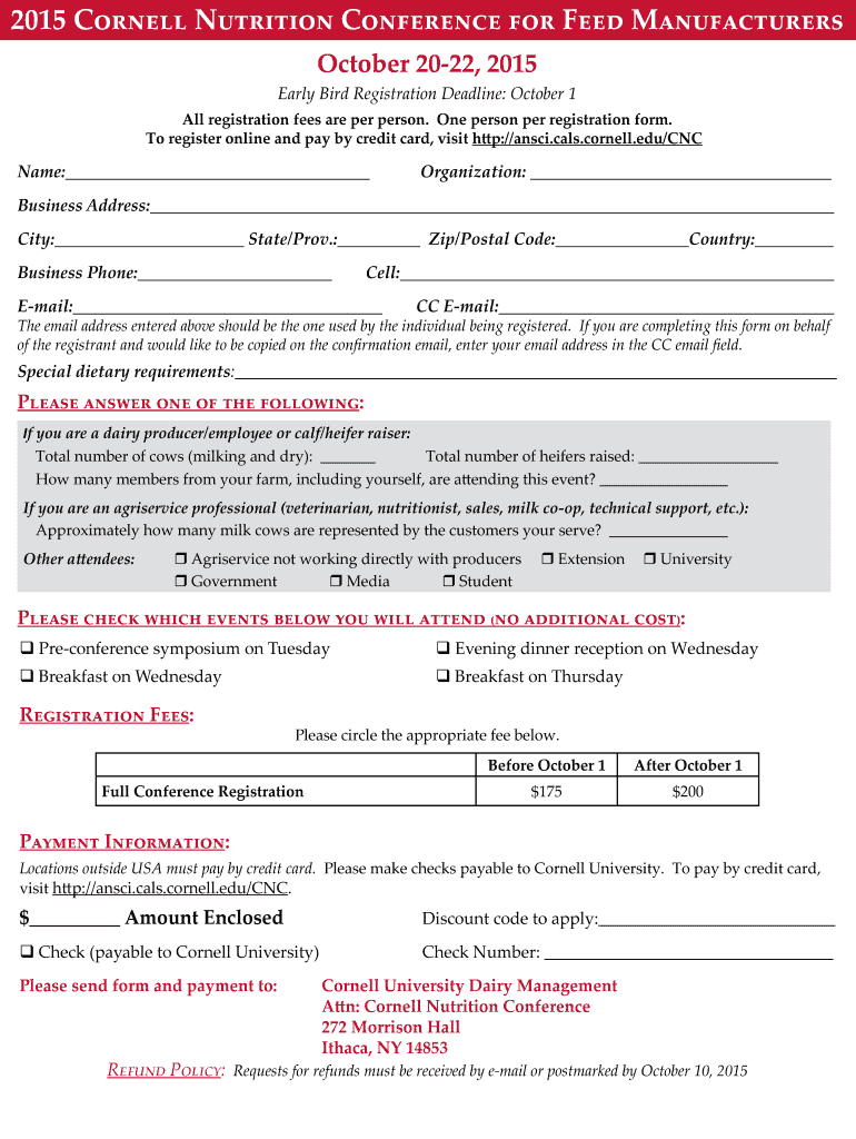 2015 Cornell Nutrition Conference for Feed Manufacturers October 2022, 2015 Early Bird Registration Deadline: October 1 All registration fees are per person. One person per registration form. To register