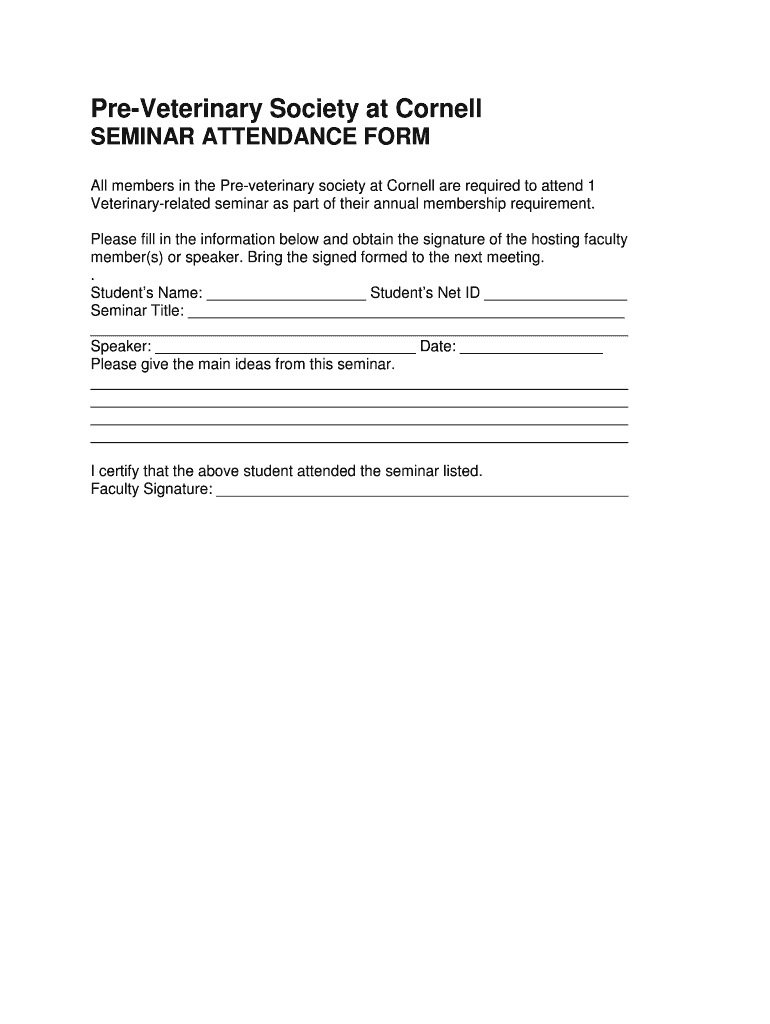 Pre-veterinary Society at Cornell SEMINAR ATTENDANCE FORM All members in the Pre-veterinary society at Cornell are required to attend 1 Veterinary related seminar as part of their annual membership