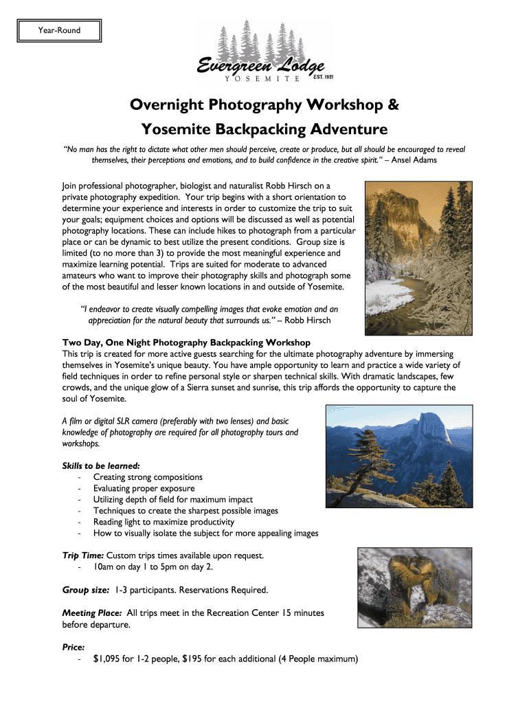 YearRoundOvernight Photography Workshop & Yosemite Backpacking Adventure No man has the right to dictate what other men should perceive, create or produce, but all should be encouraged to reveal themselves,