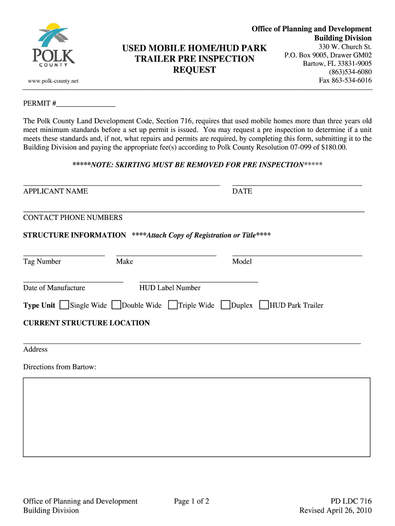 Office of Planning and Development Building Division USED MOBILE HOME×HUD PARK TRAILER PRE INSPECTION REQUEST www.polk-county.net 330 W. Church St. P.O. Box 9005, Drawer GM02 Barton, FL 33831-9005