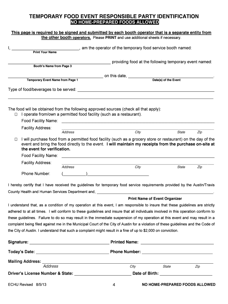 TEMPORARY FOOD EVENT RESPONSIBLE PARTY IDENTIFICATION NO HOME-PREPARED FOODS ALLOWED This page is required to be signed and submitted by each booth operator that is a separate entity from the other