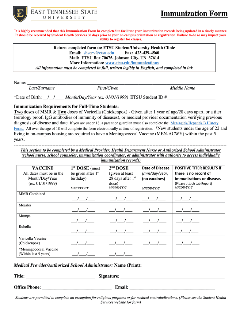 Students who are enrolling in programs or classes at East Tennessee State University (ETSU) typically need to complete the immunization form.