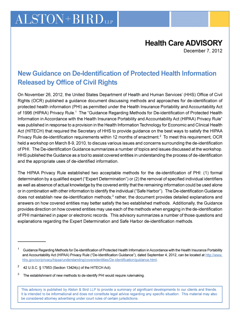 Health Care ADVISORY December 7, 2012, New Guidance on Identification of Protected Health Information Released by Office of Civil Rights On November 26, 2012, the United States Department of Health