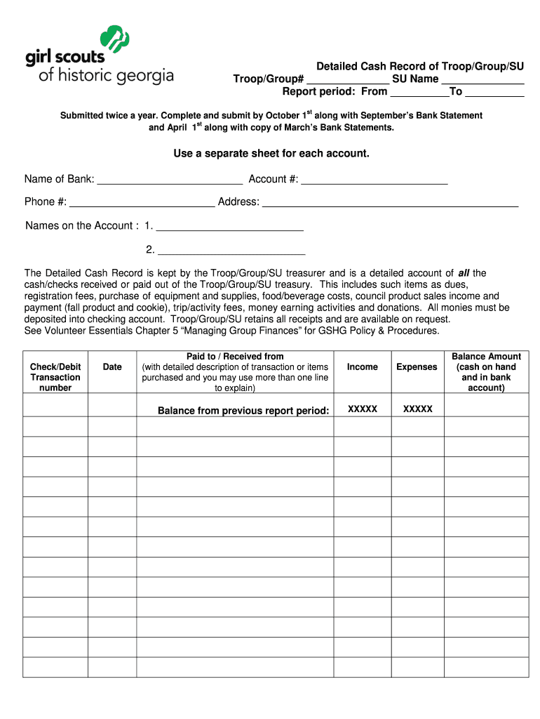 Detailed Cash Record of Troop×Group×SU Troop×Group# SU Name Report period: From To st Submitted twice a year. Complete and submit by October 1 along with Septembers Bank Statement st and April