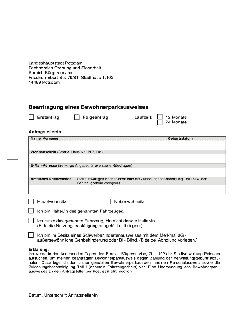 Landeshauptstadt Potsdam Fachbereich Opening UND Sicherheit Breach Pre-service FriedrichEbertStr. 79×81, Status 1.102 14469 Potsdam Beantragung lines Bewohnerparkausweises Erstantrag Folgeantrag