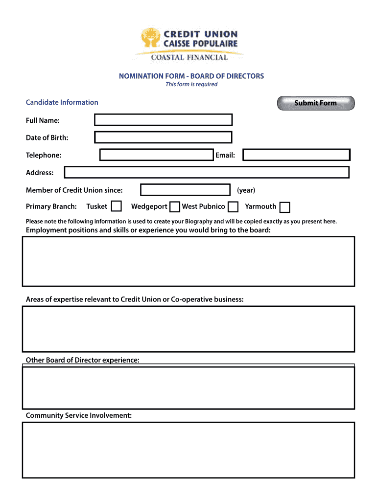Get the free NOMINATION FORM - BOARD OF DIRECTORS This form is required - coastalfinancial