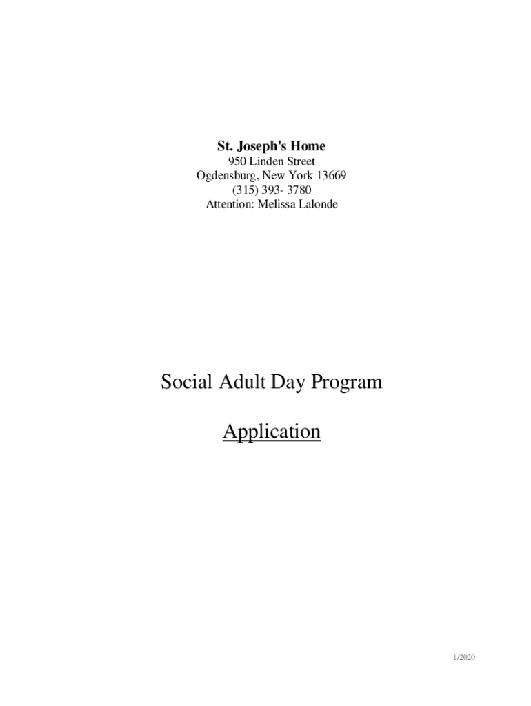St. Joseph\'s Home 950 Linden Street Oldenburg, New York 13669 (315) 393 3780 Attention: Melissa LalondeSocial Adult Day Program Application1/2020St. Josephs Home Social Adult Day Program 950 Linden