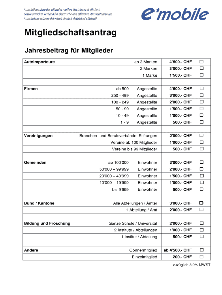 Mitgliedschaftsantrag Jahresbeitrag for Mitglieder ab 3 Market 4500. CHF 2 Market 3000. CHF 1 Make 1500. CHF ab 500 Angestellte 4500. CHF 250 499 Angestellte 3 '000. CHF 100 249 Angestellte 2 '000.
