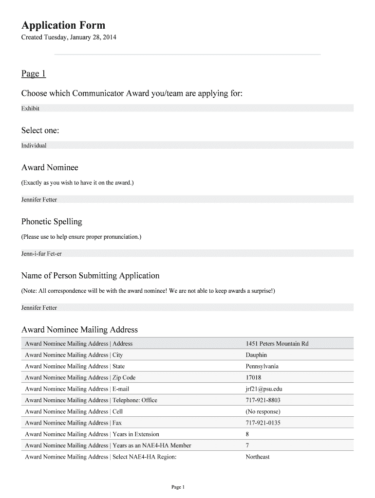 Application Form Created Tuesday, January 28, 2014-Page 1 Choose which Communicator Award you×team are applying for: Exhibit Select one: Individual Award Nominee (Exactly as you wish to have it on