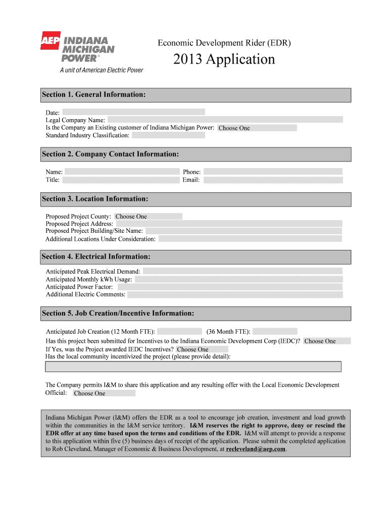 Section 1. General Information: Date: Legal Company Name: Is the Company an Existing customer of Indiana Michigan Power: Choose One Standard Industry Classification: Section 2. Company Contact Information: