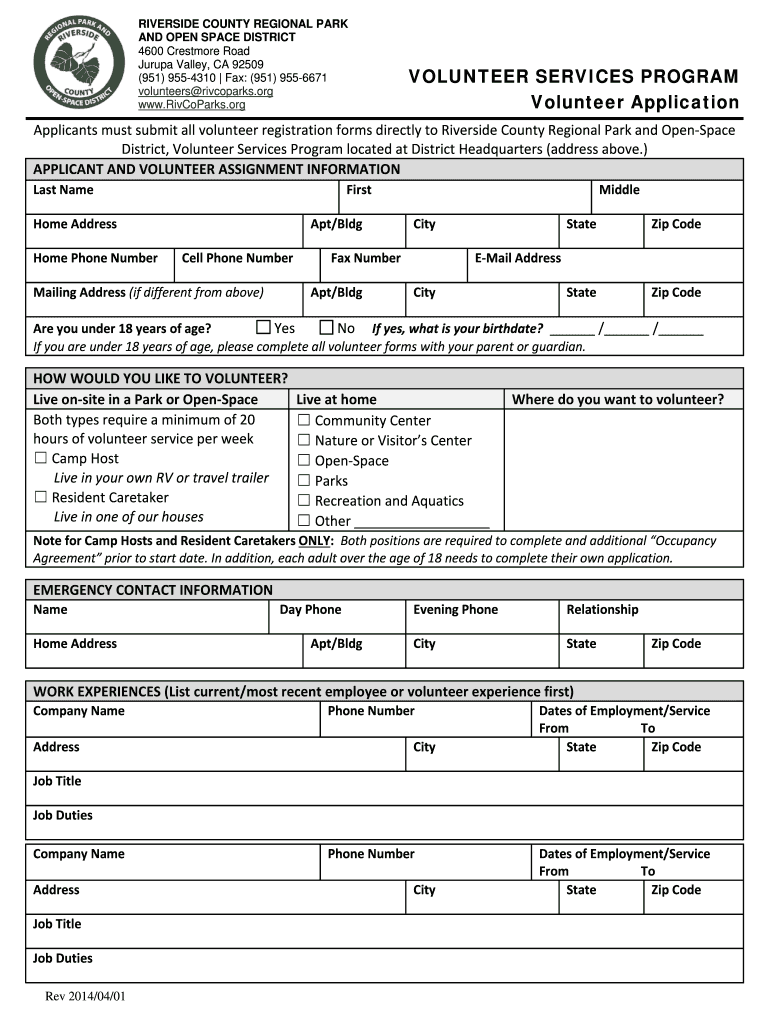 Dear Prospective Volunteer: Thanks for your interest in Riverside County Regional Park and Open-Space District s Volunteer Services Program. The District preserves, protects, and provides services