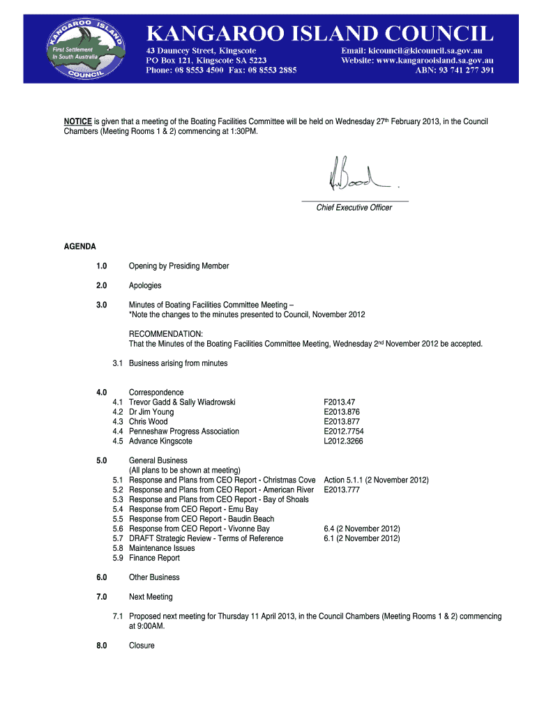 A notice for the upcoming meeting of the Boating Facilities Committee outlining the agenda, business, and correspondence to be discussed.
