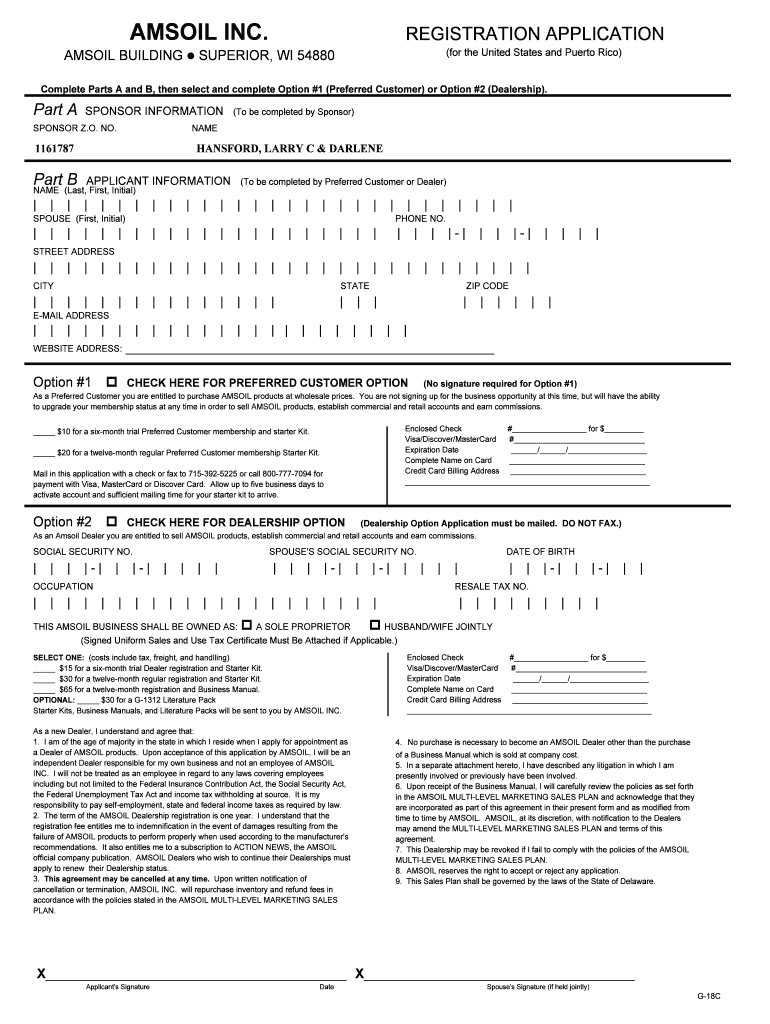 SOIL INC. REGISTRATION APPLICATION SOIL BUILDING l SUPERIOR, WI 54880 (for the United States and Puerto Rico) Complete Parts A and B, then select and complete Option #1 (Preferred Customer) or Option