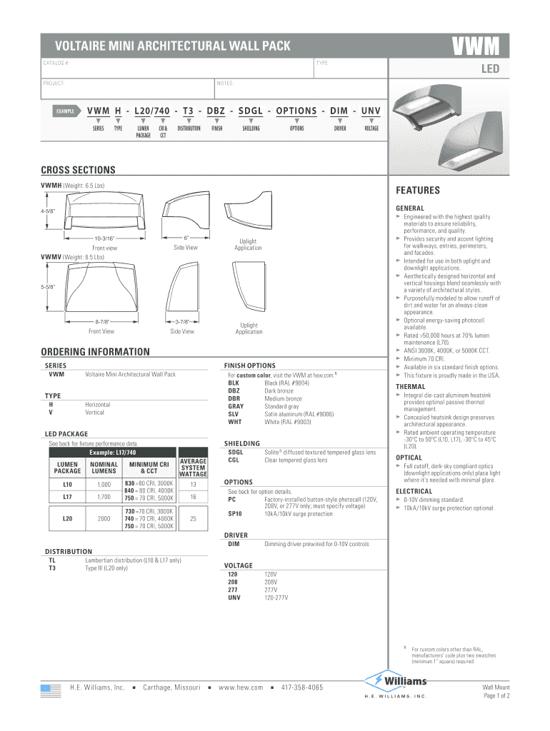 VM VOLTAIRE MINI ARCHITECTURAL WALL PACK CATALOG #: TYPE: PROJECT: EXAMPLE LED NOTES: V WM H L20×740 T3 DBZ SDGE OPTIONS DIM UNV t t t SERIES TYPE LUMEN PACKAGE t t t t CRY & DISTRIBUTION FINISH