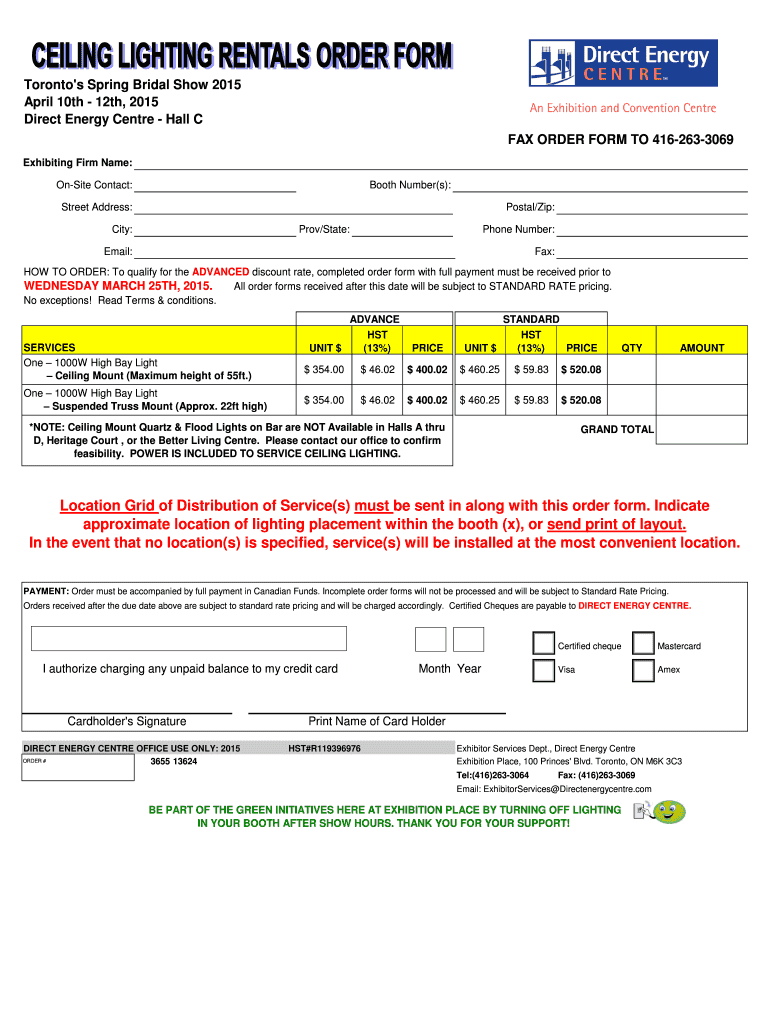 Toronto's Spring Bridal Show 2015 April 10th 12th, 2015 Direct Energy Center Hall C FAX ORDER FORM TO 4162633069 Exhibiting Firm Names: Onsite Contact: Booth Number’s): Street Address: Postal×Zip: