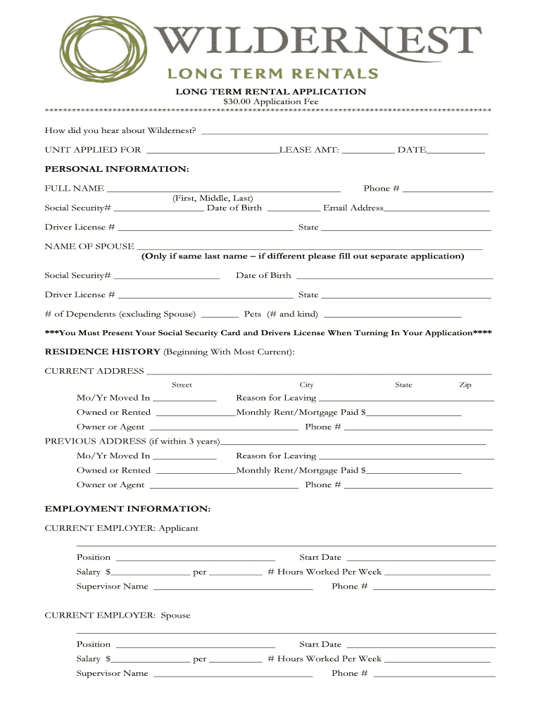 LONG TERM RENTAL APPLICATION $30.00 Application Fee *************************************************************************************************** How did you hear about Wilderness? UNIT APPLIED