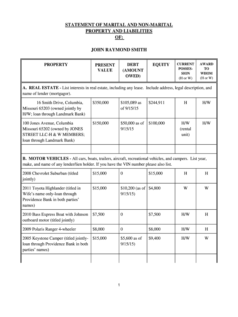 STATEMENT OF MARITAL AND MARITAL PROPERTY AND LIABILITIES OF: JOHN RAYMOND SMITH PROPERTYDEBT (AMOUNT OWED×PRESENT VALUEEQUITYCURRENT POSSESSION×H or W×AWARD TO WHOM (H or W×A. REAL ESTATE List