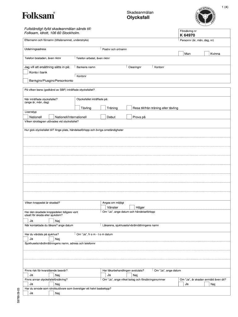 1 ×4) Skadeanmlan Olycksfall Fullstndigt idyll skadeanmlan ends till: Folks am, Idiot, 106 60 Stockholm. Frisking NR K 64970 External och frame (tilltalsnamnet, understands) Utdelningsadress Person