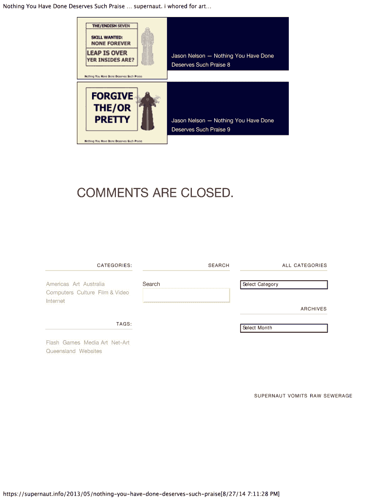Nothing You Have Done Deserves Such Praise supernal. I whorled for art HOME ABOUT CATEGORIES ARCHIVES SEARCH CONTACT supernal I whorled for art Written on May 28, 2013, NOTHING YOU HAVE DONE DESERVES