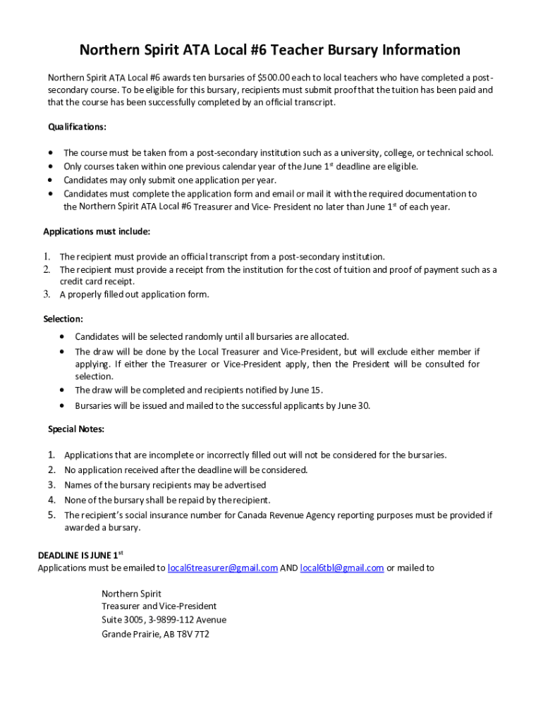 Get the free Northern Spirit ATA Local #6 Teacher Bursary Information