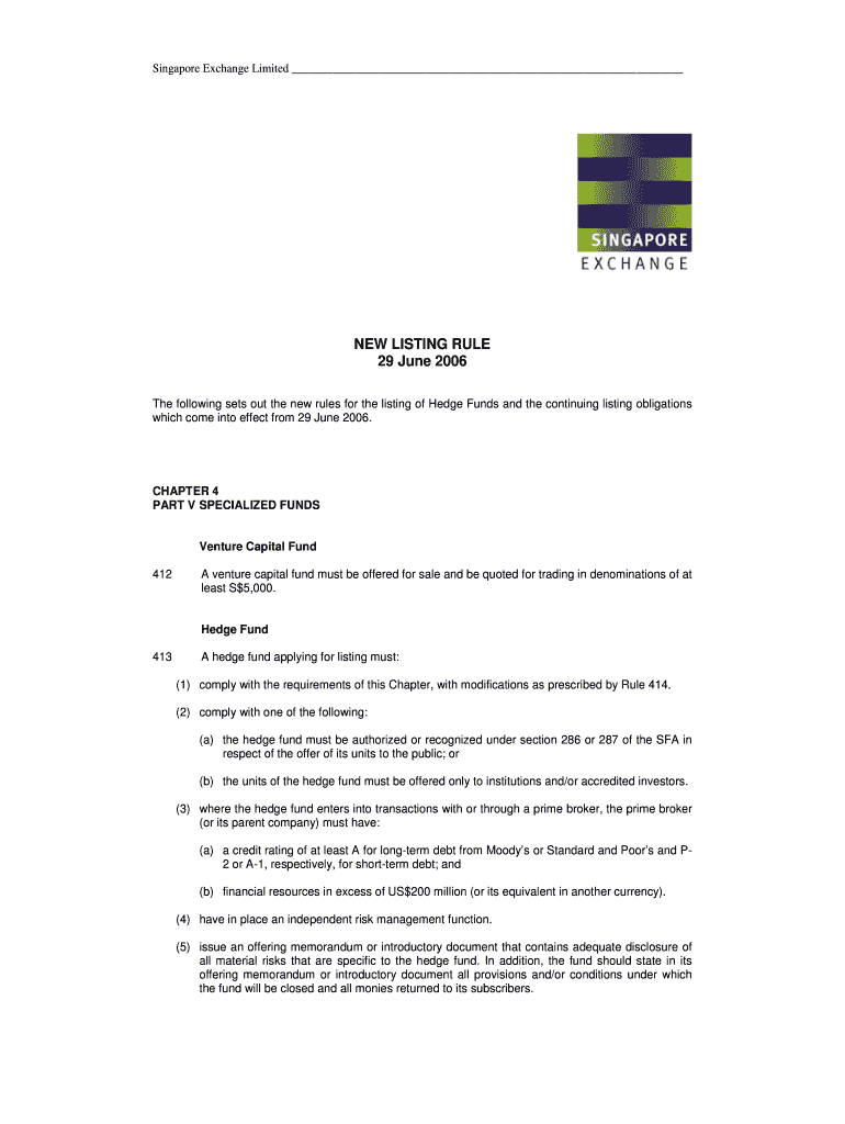 Singapore Exchange Limited NEW LISTING RULE 29 June 2006 The following sets out the new rules for the listing of Hedge Funds and the continuing listing obligations which come into effect from 29 June