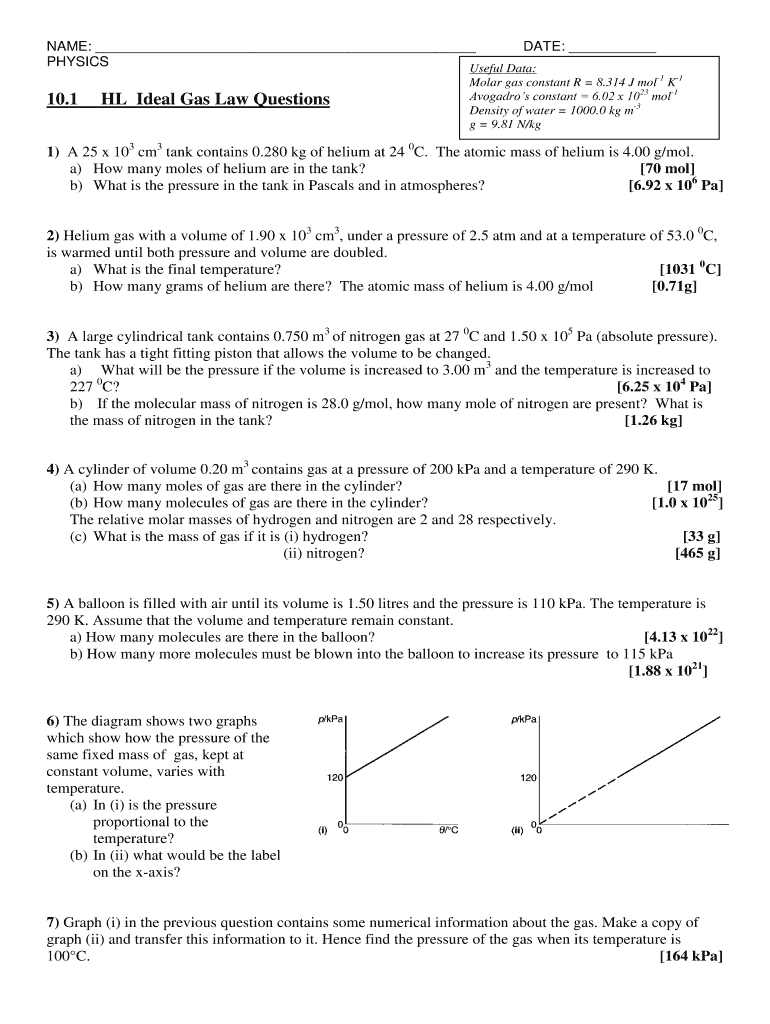 NAME: DATE: PHYSICS Useful Data: 10.1 HL Ideal Gas Law Questions Molar gas constant R 8.314 J mol1 K1 Avogadro's constant 6.02 × 1023 mol1 Density of water 1000.0 kg m3 g 9.81 N×kg 1× A 25 × 103