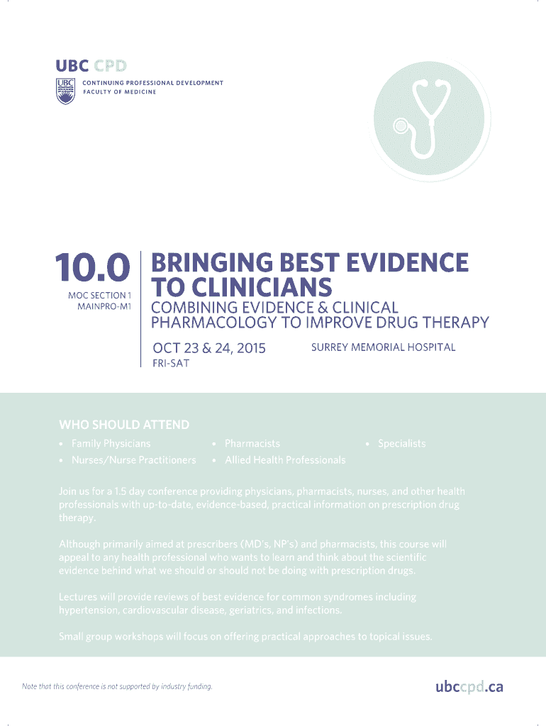 10.0 MOC SECTION 1 MAINPRO-M1 BRINGING BEST EVIDENCE TO CLINICIANS COMBINING EVIDENCE & CLINICAL PHARMACOLOGY TO IMPROVE DRUG THERAPY OCT 23 & 24, 2015 SURREY MEMORIAL HOSPITAL FRI-SAT WHO SHOULD