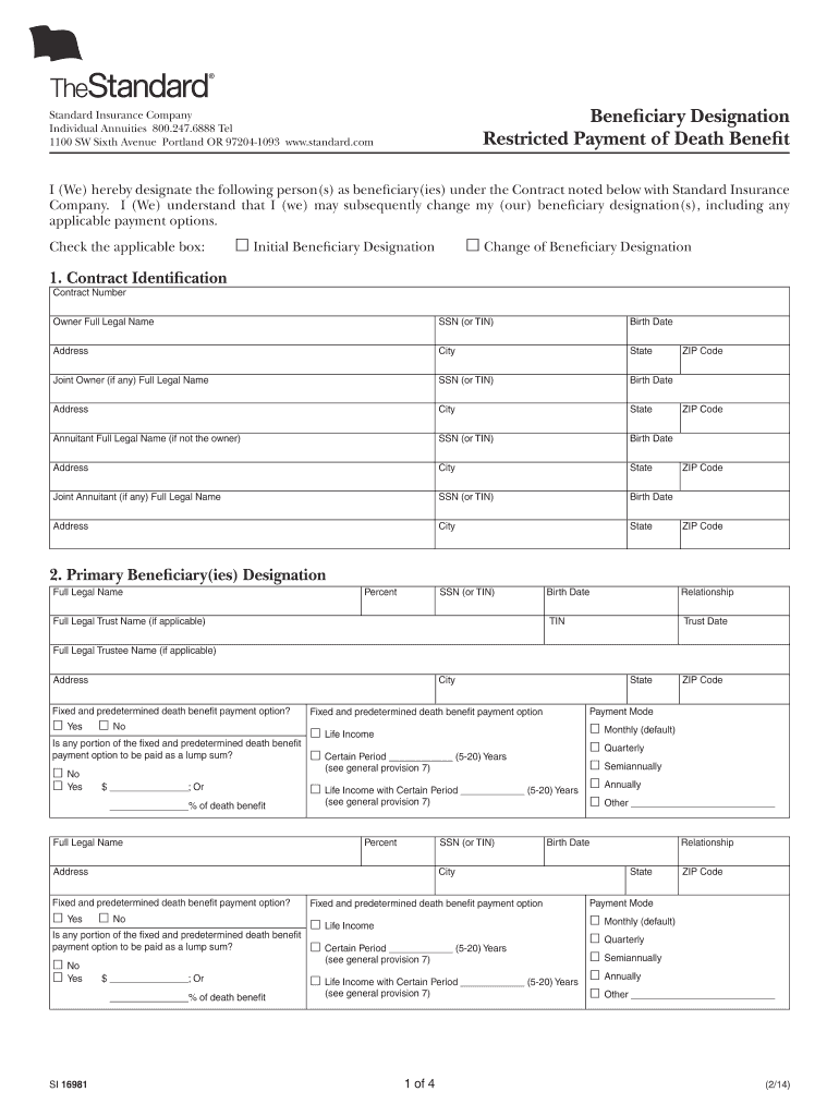 Reset Beneficiary Designation Restricted Payment of Death Benet Standard Insurance Company Individual Annuities 800.247.6888 Tel 1100 SW Sixth Avenue Portland OR 972041093 www.standard.com I (We)