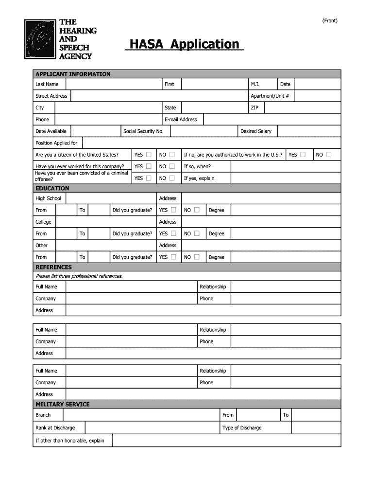 (Front) HAS Application APPLICANT INFORMATION Last Name First M.I. Street Address Date Apartment×Unit # City State Phone Email Address Date Available ZIP Social Security No. Desired Salary Position