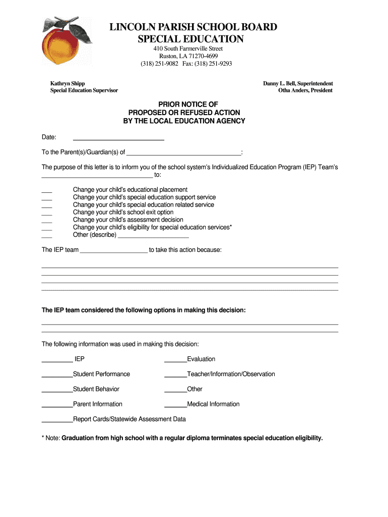 LINCOLN PARISH SCHOOL BOARD SPECIAL EDUCATION 410 South Farmville Street Huston, LA 712704699 ×318× 2519082 Fax: (318× 2519293 Kathryn Ships Special Education Supervisor Danny L. Bell, Superintendent