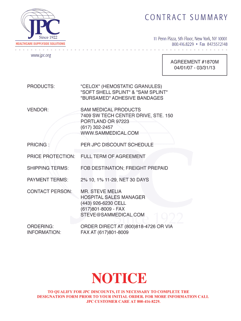 CONTRACT SUMMARY 11 Penn Plaza, 5th Floor, New York, NY 10001 800.416.8229 Fax 847.557.2148 HEALTHCARE SUPPLYING SOLUTIONS www.jpc.org AGREEMENT #1870M 04×01/07 03×31/13 Products: “below (Homeostatic