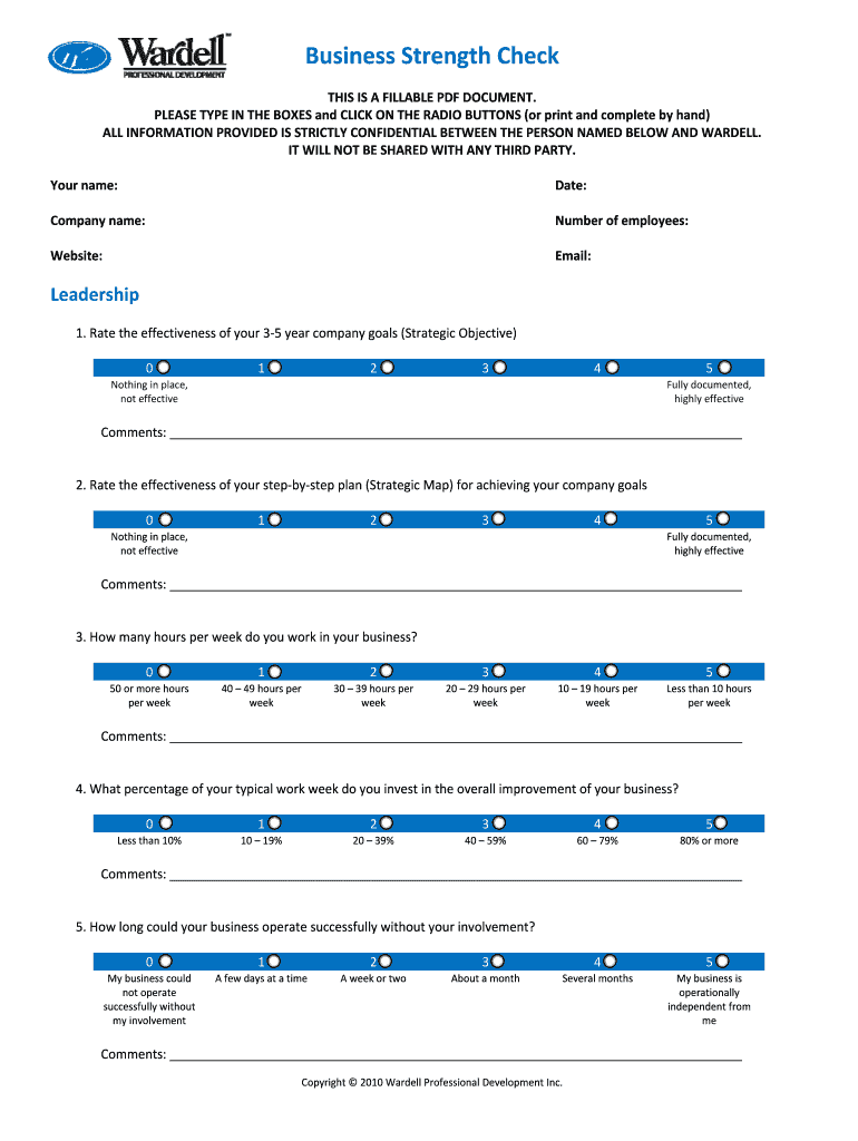 BusinessStrengthCheck THISISAFILLABLEPDFDOCUMENT. PLEASETYPEINTHEBOXESandCLICKONTHERADIOBUTTONS×orprintandcompletebyhand) ALLINFORMATIONPROVIDEDISSTRICTLYCONFIDENTIALBETWEENTHEPERSONNAMEDBELOWANDWARDELL.