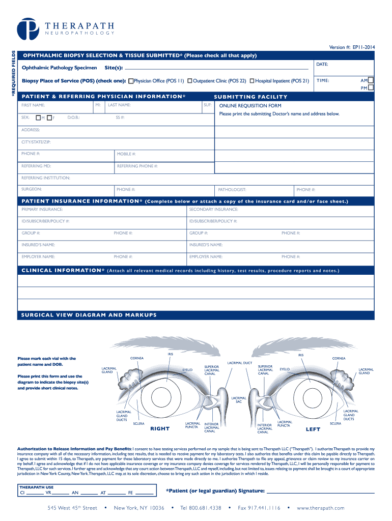N E U R O P A T H O L O G Y Version #: EP112014 OPHTHALMIC BIOPSY SELECTION & TISSUE SUBMITTED* (Please check all that apply) DATE: Site’s): Ophthalmic Pathology Specimen Biopsy Place of Service