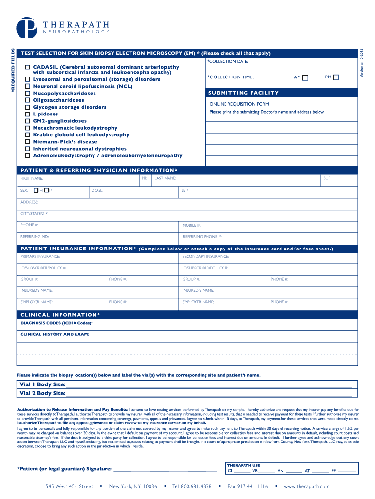 Version #: 122015 N E U R O P A T H O L O G Y TEST SELECTION FOR SKIN BIOPSY ELECTRON MICROSCOPY (EM) * (Please check all that apply) *COLLECTION DATE: CADA SIL (Cerebral autosomal dominant arthropathy