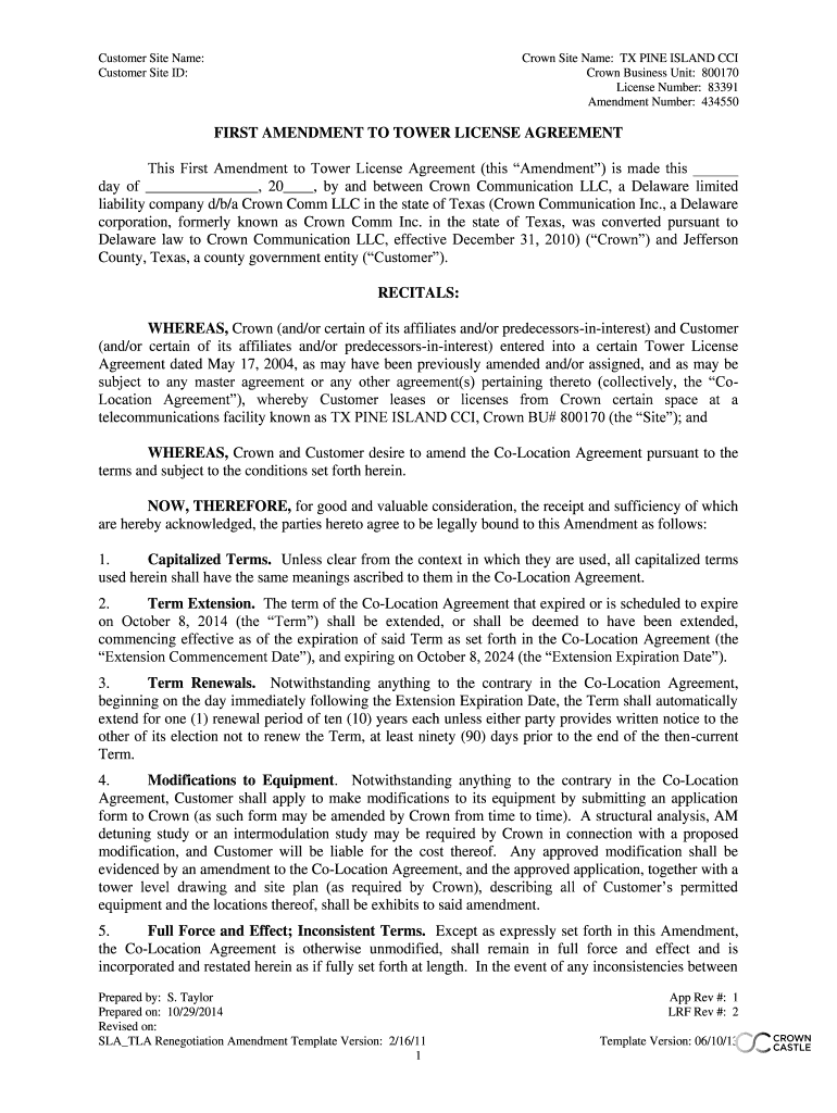 Customer Site Name: Customer Site ID: Crown Site Name: TX PINE ISLAND CCI Crown Business Unit: 800170 License Number: 83391 Amendment Number: 434550 FIRST AMENDMENT TO TOWER LICENSE AGREEMENT This