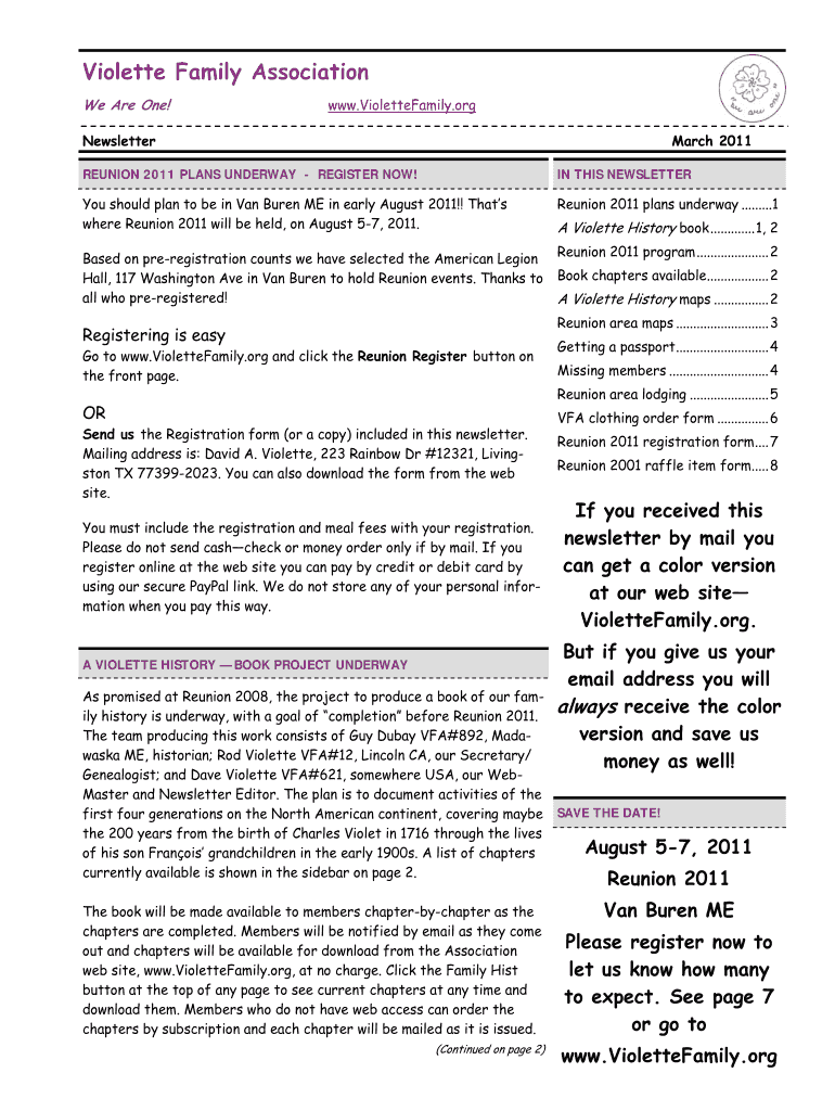 Violetta Family Association We Are One! www.VioletteFamily.org Newsletter March 2011 REUNION 2011 PLANS UNDERWAY REGISTER NOW! IN THIS NEWSLETTER You should plan to be in Van Buren ME in early August