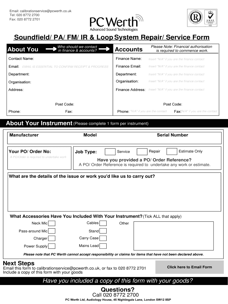 Email: calibration service Perth.co.UK Tel: 020 8772 2700 Fax: 020 8772 2701 Sound field/ PA/ FM/ IR & Loop System Repair/ Service Form Who should we contact in finance & accounts? About You Please