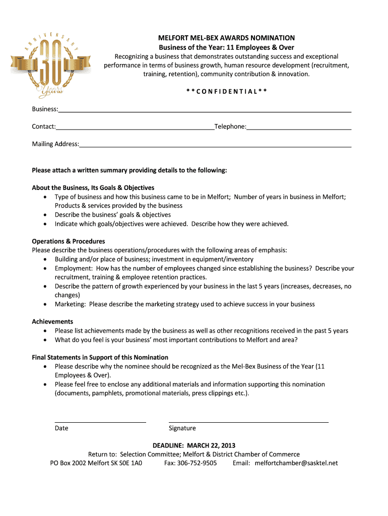 Get the free Nomination Form - Business of the Year Award 11 and Over
