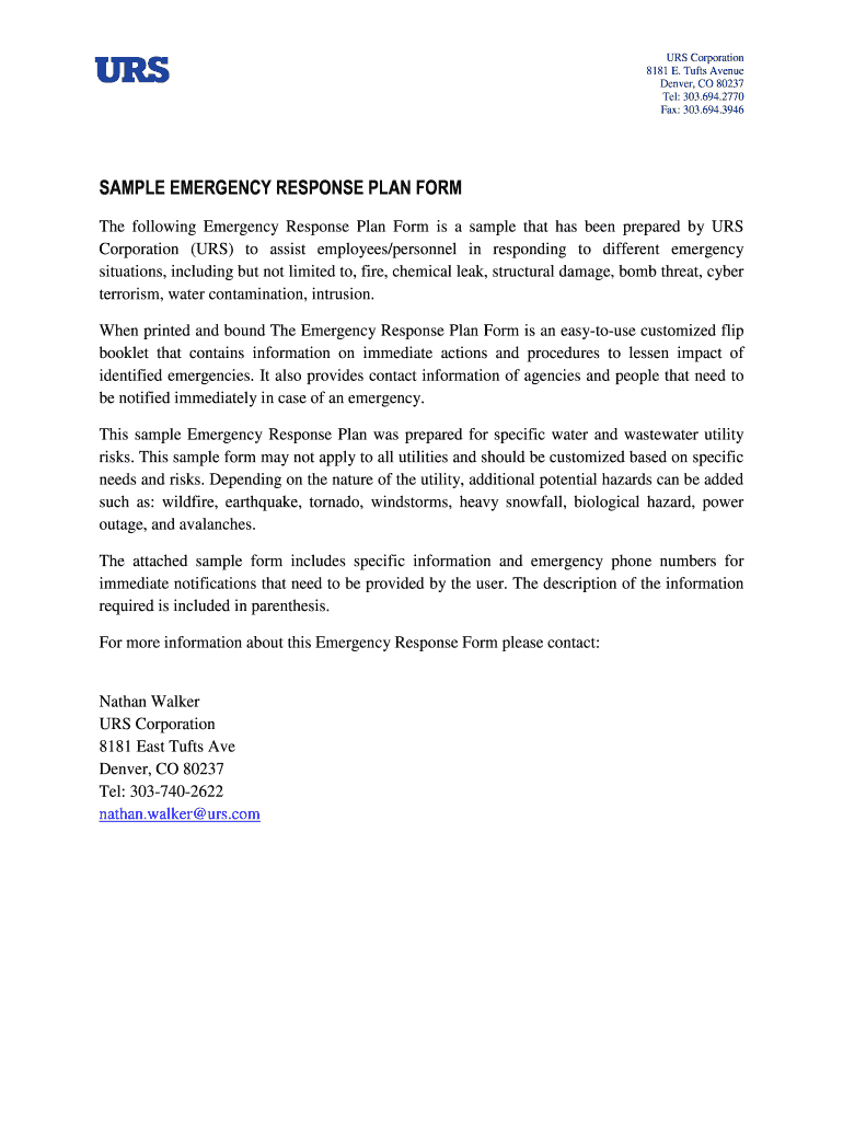 URS Corporation 8181 E. Tufts Avenue Denver, CO 80237 Tel: 303.694.2770 Fax: 303.694.3946 SAMPLE EMERGENCY RESPONSE PLAN FORM The following Emergency Response Plan Form is a sample that has been prepared