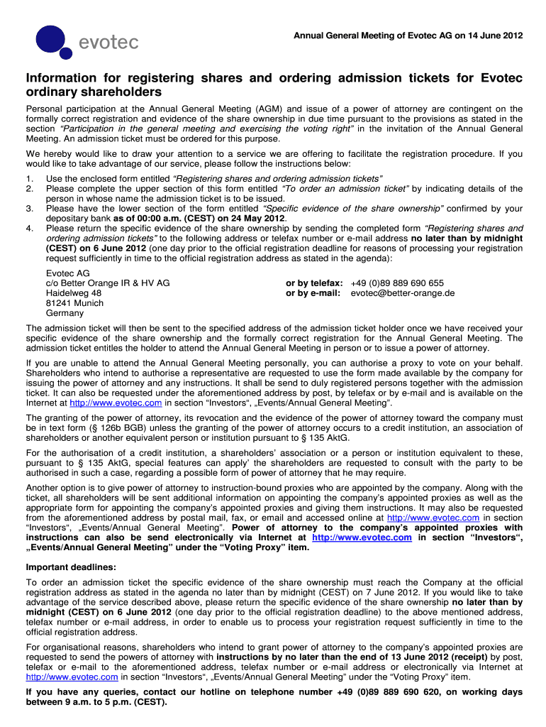 Annual General Meeting of Evotec AG on 14 June 2012 Information for registering shares and ordering admission tickets for Evotec ordinary shareholders Personal participation at the Annual General