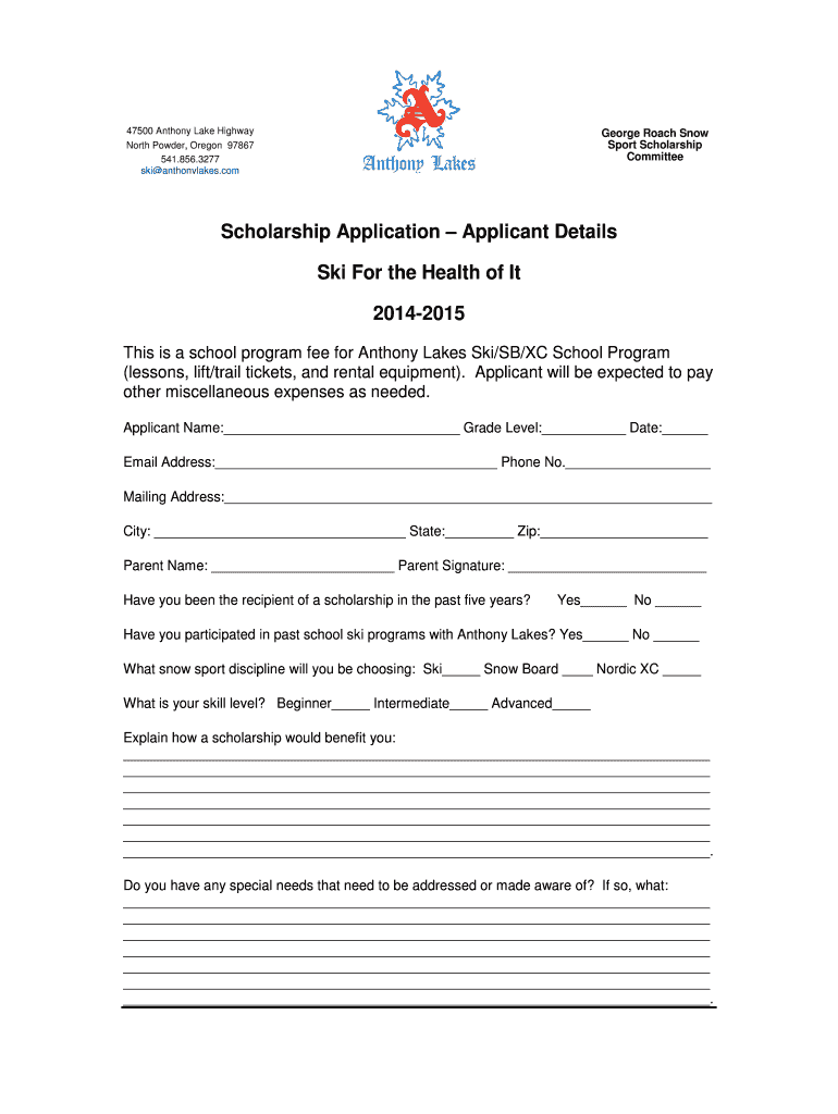 47500 Anthony Lake Highway North Powder, Oregon 97867 541.856.3277 ski anthonylakes.com George Roach Snow Sport Scholarship Committee Scholarship Application Applicant Details Ski For the Health of