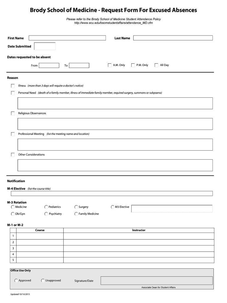 14 Oct 2015 b...×b Brody school×b of medicine×b request Form×b For Excused Absences. Please refer to BR the Brody school×b of medicine×b Student Attendance Policy.