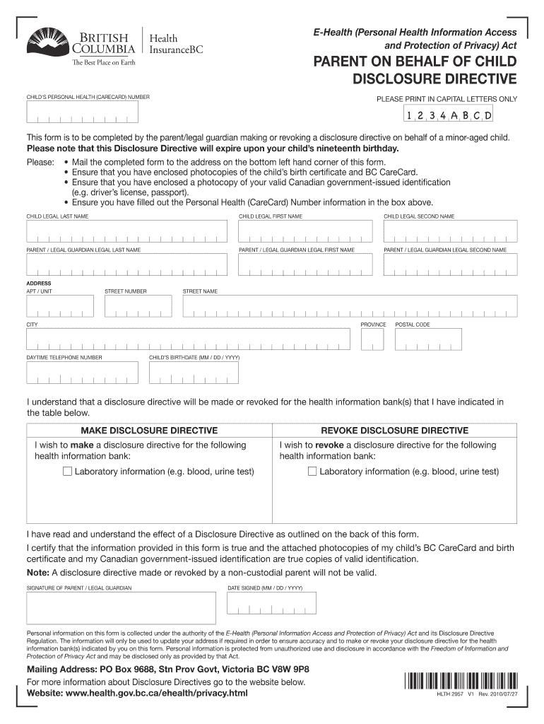 The form can be used by parents or legal guardians of minor children in British Columbia who wish to establish or revoke a disclosure directive for personal health information.