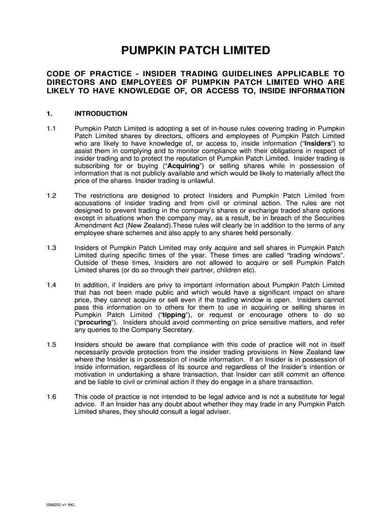 PUMPKIN PATCH LIMITED CODE OF PRACTICE INSIDER TRADING GUIDELINES APPLICABLE TO DIRECTORS AND EMPLOYEES OF PUMPKIN PATCH LIMITED WHO ARE LIKELY TO HAVE KNOWLEDGE OF, OR ACCESS TO, INSIDE INFORMATION
