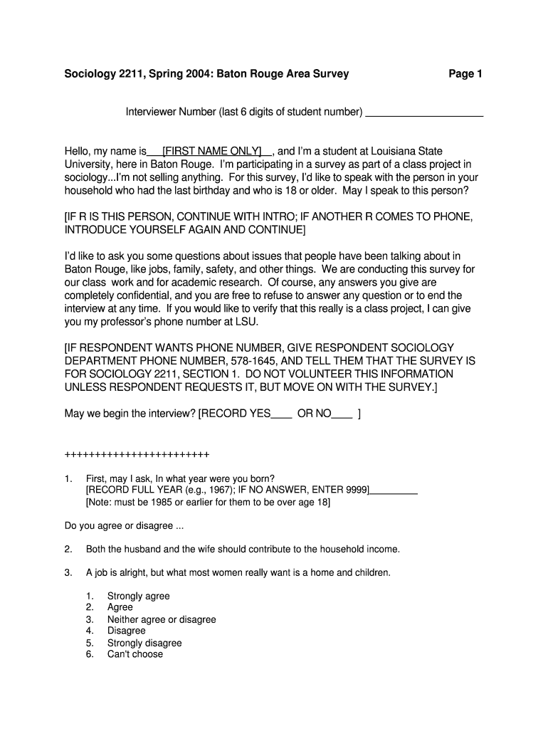Get the free Sociology 2211, Spring 2004: Baton Rouge Area Survey Page 1 Interviewer Number (last...