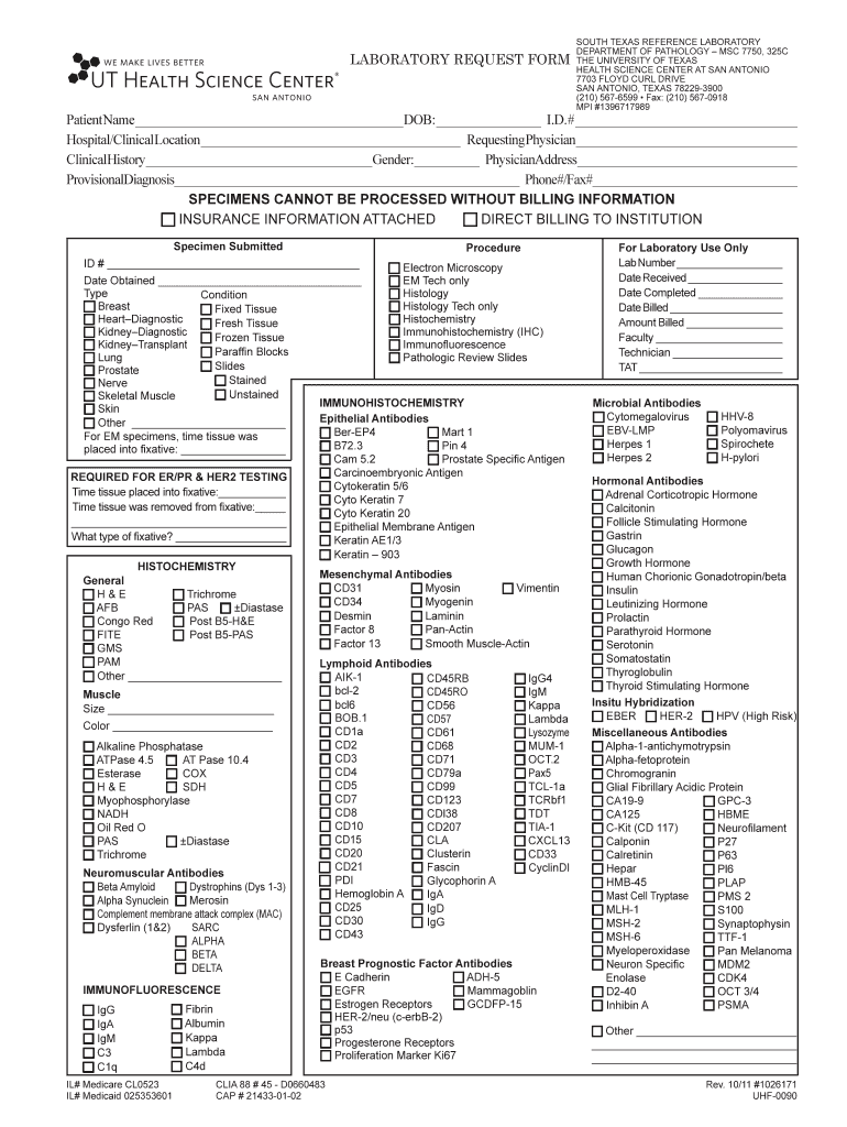 LABORATORY REQUEST FORM SOUTH TEXAS REFERENCE LABORATORY DEPARTMENT OF PATHOLOGY MSC 7750, 325C THE UNIVERSITY OF TEXAS HEALTH SCIENCE CENTER AT SAN ANTONIO 7703 FLOYD CURL DRIVE SAN ANTONIO, TEXAS