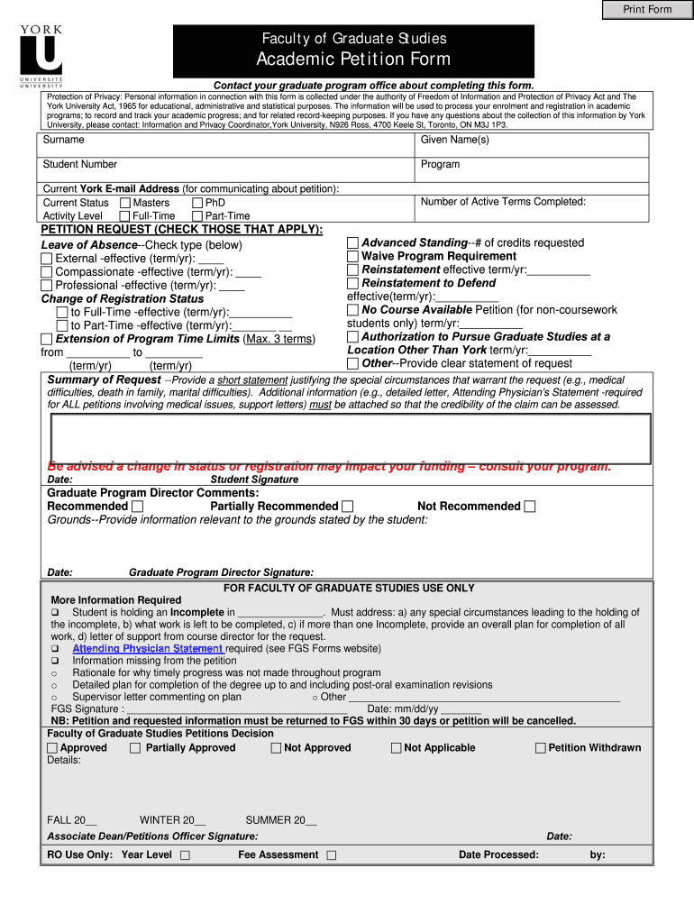 The Academic Petition Form is designed for graduate students enrolled at York University who need to request various academic accommodations such as leave of absence or changes to their registration status.