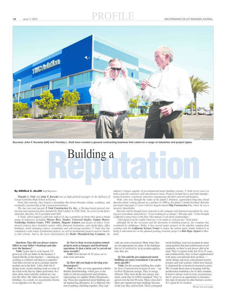 12PROFILEJune 11, 2012SAN FERNANDO VALLEY BUSINESS JOURNALPHOTO BY THOMAS WASPERSuccess: John F. Eureka (left) and Timothy L. Viol have created a general contracting business that caters to a range