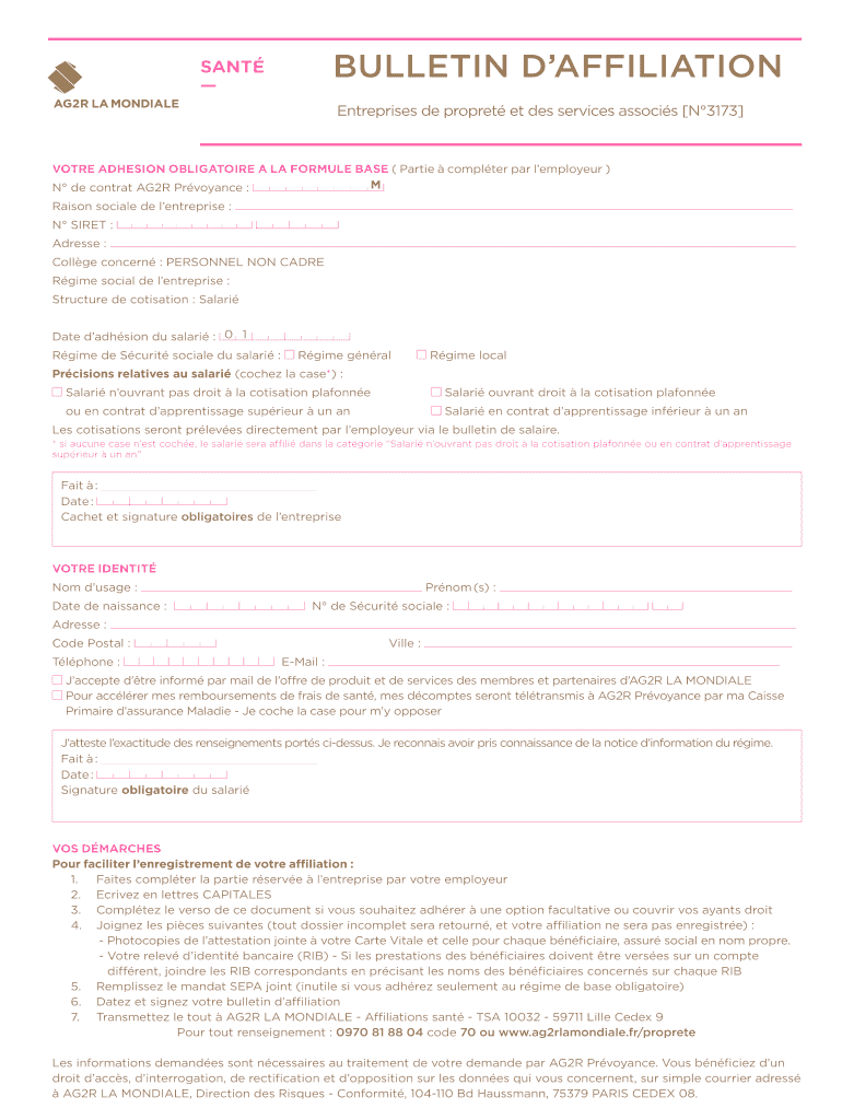 BULLETIN AFFILIATION SENT Enterprises DE prophet et DES services assoc is N3173 VOTE ADHESION OBLIGATORY À la FORMULA BASE (Parties computer par employer) M N de contract AG2R Purveyance : Raisin