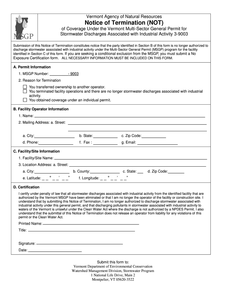 Vermont Agency of Natural Resources Notice of Termination (NOT) of Coverage Under the Vermont Multi-Sector General Permit for Stormwater Discharges Associated with Industrial Activity 3-9003 Submission